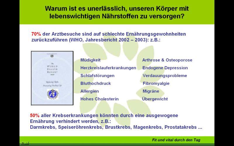 50% aller Krebserkrankungen könnten durch eine ausgewogene Ernährung verhindert werden, z.B.: Speiseröhren-, Magen-, Darmkrebs, Brustkrebs, Prostatakrebs ...